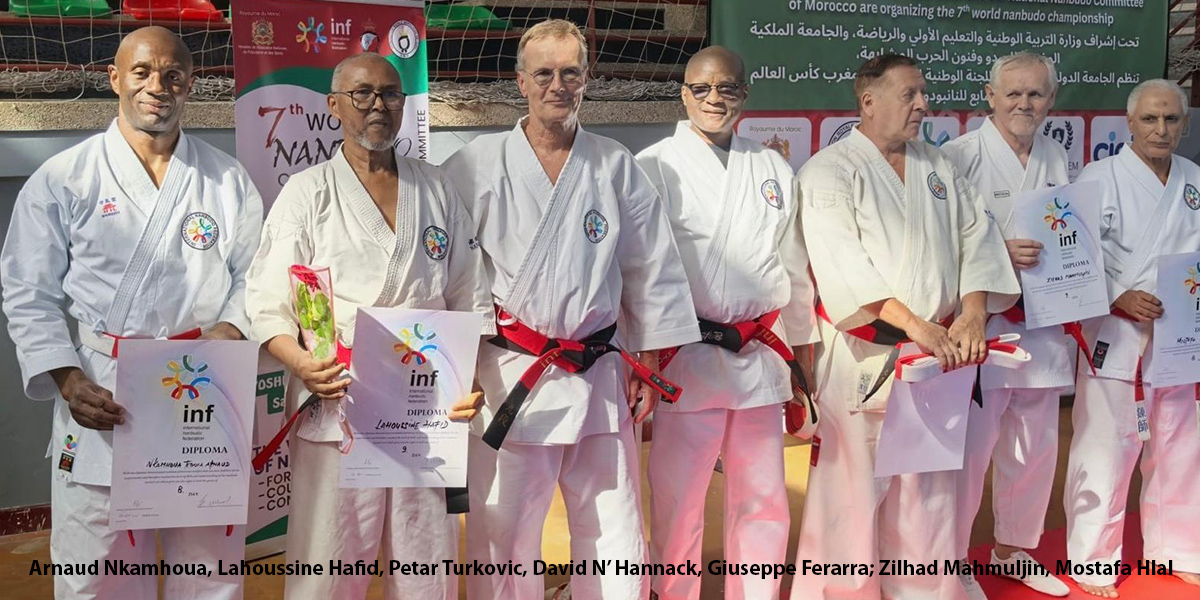 INF President Arnaud Nkamhoua promoted Petar Turkovic, founder of the Federation, who in turn promoted his colleagues Zilhad Mahmuljin, David N’Hannack, Giuseppe Ferarra, and Lahoussine Hafid. With this act, INF paid tribute to their lifelong contribution to the promotion and development of nanbudo worldwide.